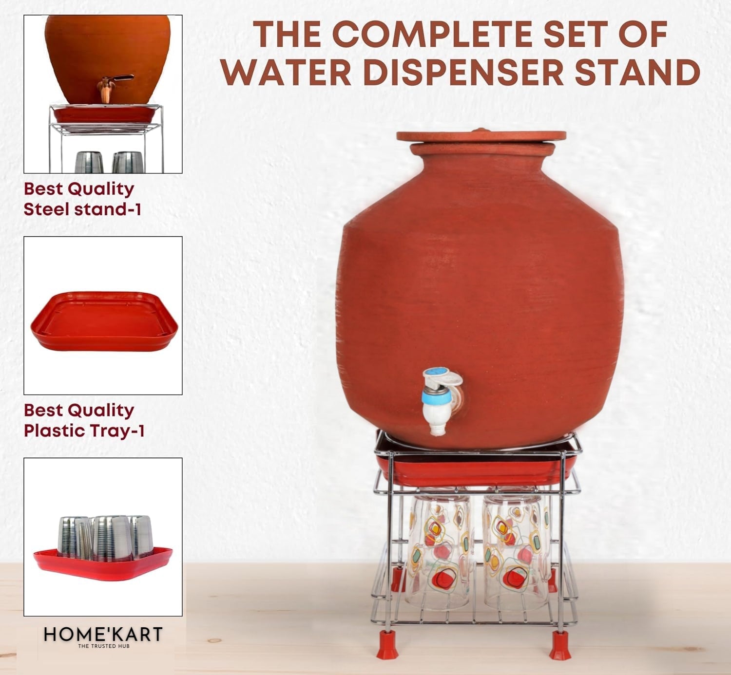 is designed to hold a traditional clay Matka, while the dispenser tray collects water that drips from the Matka. The tray stores the water to prevent wastage.