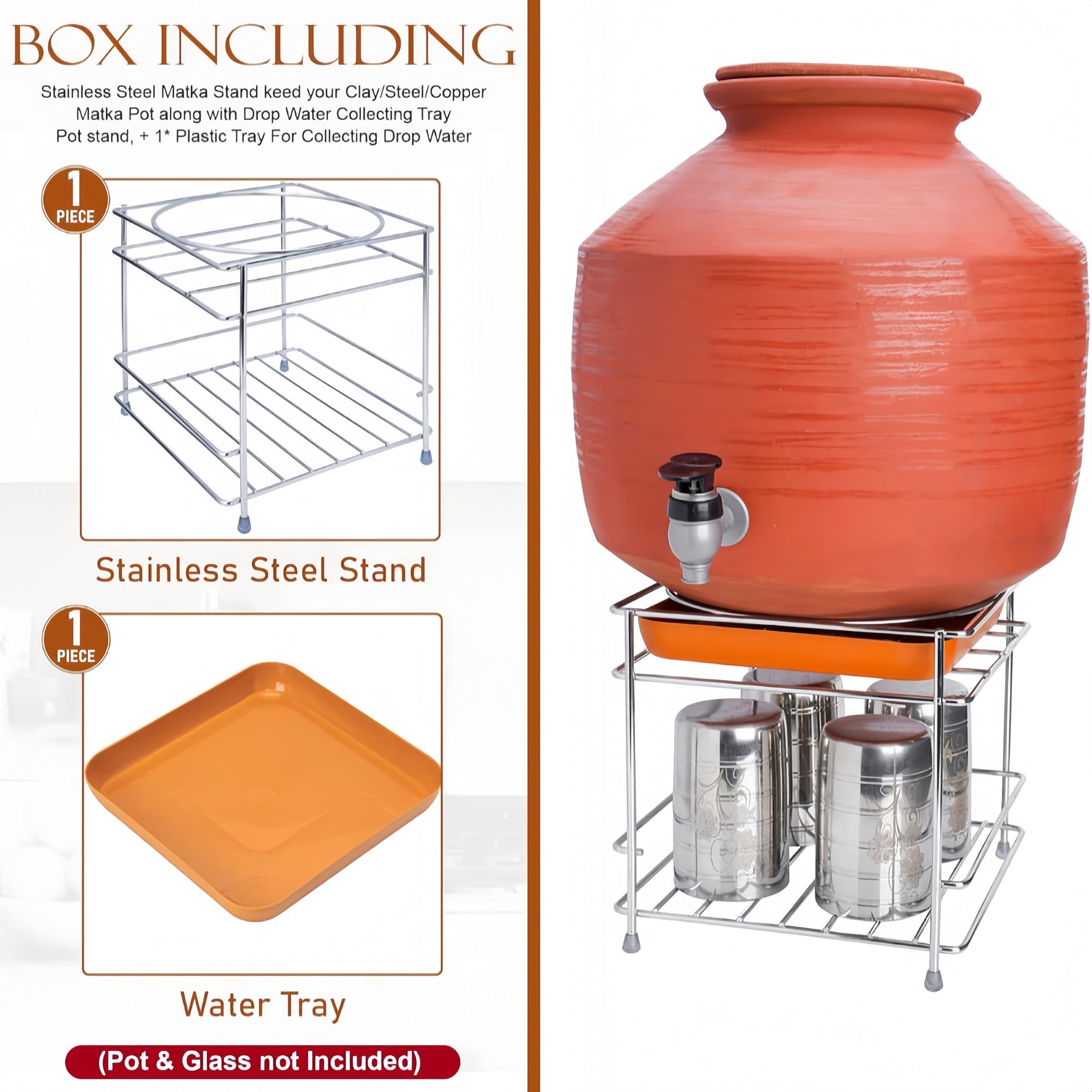 The steel tray ensures no water is wasted by collecting any drips from the Matka, making it both efficient and eco-friendly.